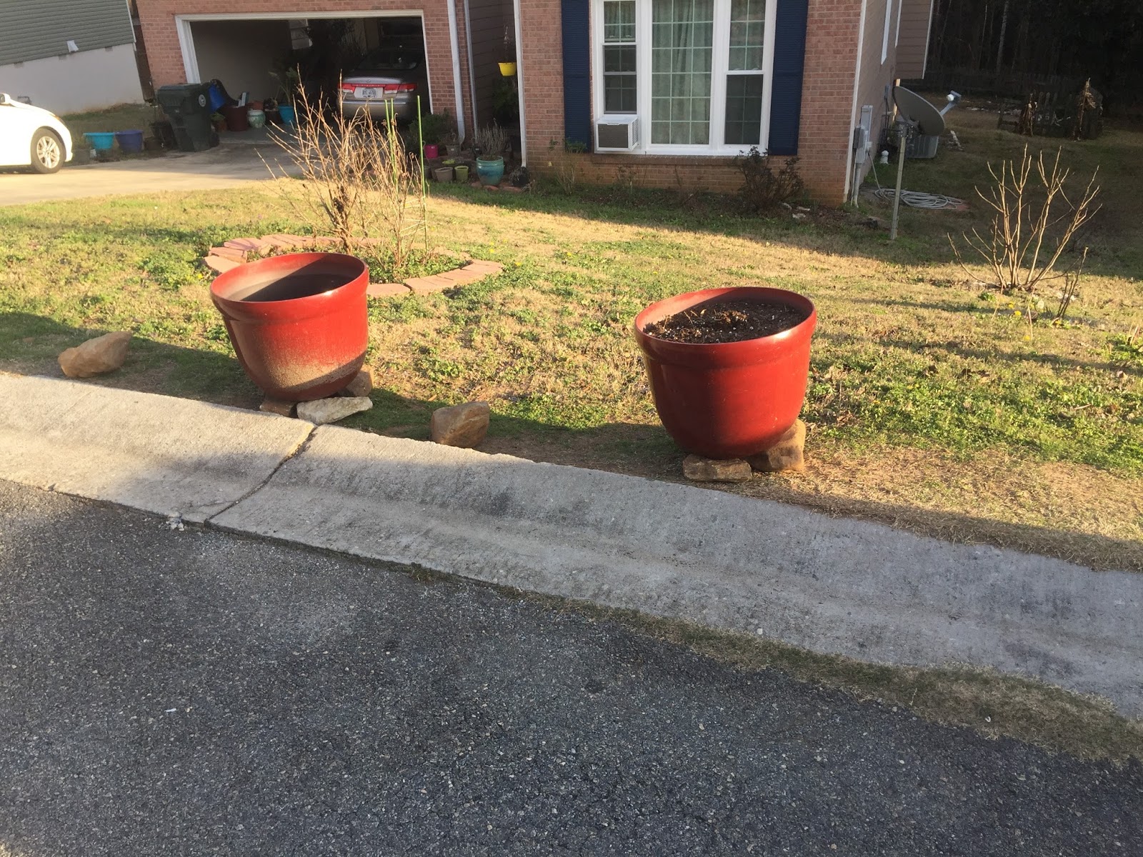 He wasn't the only one who was diligent; Sweetie and Grump moved some large pots to the front of our yard. They did this to stop the constant stream of visitors to the folks next door, (are they selling drugs or what?), who by parking in our yard have not only tore up the grass, but actually put a trench into the ground! We don't think our front yard should by default be their parking space.